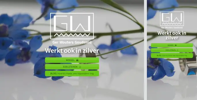 Also available in silver. Website gerwouters-goudsmid.nl is a Dutch jewelry site with a shop, gemstone laboratory, tests for individuals and businesses, research requests, a blog (including ‘How it’s made: a special ring’), and sections like About Us, inspiration, contact, newsletter signup, and user login, plus links to social media.