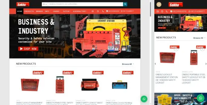 This website is a catalog and shop for ONEBIZ safety and maintenance products. It lists items such as spill kits, absorbents, clean room supplies, sticky mats, hand tools, chemicals, safety gear like respirators, and other safety and cleaning equipment. It shows new products, a full catalog, information about customers, store locations, and a login for users.